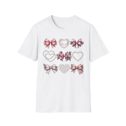 Coquette Bow, Pearls, and Hearts Shirt, Trendy and Chic design, Everyday Casual Wear, Unique Gift Idea, Unisex Softstyle Tee
